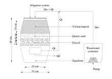In principle, provided the environment is aerobic, the longer the wastewater remains inside the filter, the greater the BOD5 and COD removal efficiency will be, but at the expense of hydraulic loading. Wastewater requires sufficient contact time with the biofilm to allow for the adsorption, transformation, and reduction of contaminants.[21] The hydraulic loading rate is an essential design parameter, consisting of the volume of wastewater that a vermifilter can reasonably treat in a given amount of time. For a given system, higher hydraulic loading rates will cause hydraulic retention time to decrease and therefore reduce level of treatment. Hydraulic loading rate may depend on parameters such as structure, effluent quality and bulk density of filter packing, along with method of effluent application.[22] Common hydraulic retention time values in vermifiltration systems range from 1 to 3 hours.[23] Hydraulic loading rates commonly vary between 0.2 m3 m−2 day−1,[24] 3.0 m3 m−2 day−1 [25] or 10-20 g L−1.[26] Organic loading rate is defined as the amount of soluble and particulate organic matter (as BOD5) per unit area per unit time.[22][27]