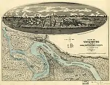 Vicksburg was strategically vital to the Confederates. Jefferson Davis said, "Vicksburg is the nail head that holds the South's two halves together."[4] While in their hands, it blocked Union navigation down the Mississippi; together with control of the mouth of the Red River and of Port Hudson to the south, it allowed communication with the states west of the river, upon which the Confederates depended extensively for horses, cattle and reinforcements. The natural defenses of the city were ideal, earning it the nickname "The Gibraltar of the Confederacy". It was located on a high bluff overlooking a horseshoe-shaped bend in the river, De Soto Peninsula, making it almost impossible to approach by ship. North and east of Vicksburg was the Mississippi Delta (sometimes known as the Yazoo Delta), an area 200 miles (320 km) north to south and up to 50 miles (80 km) across, which has been described by geographer Warren E. Grabau as an "astonishingly complex network of intersecting waterways", some of which were navigable by small steamboats. The regions between modern rivers and bayous formed closed basins called backswamps, of which Grabau judged, "Whether permanently flooded or not, the backswamps were, for all practical purposes, untamed wildernesses, utterly impassable by a man on horseback or by any form of wheeled vehicle, and very difficult even for a man on foot."[5] About twelve miles (19 km) up the Yazoo River were Confederate batteries and entrenchments at Haynes Bluff. The Louisiana land west of Vicksburg was also difficult, with many streams and poor country roads, widespread winter flooding, and it was on the opposite side of the river from the fortress.