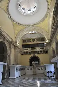 The Victoria Memorial has 25 galleries.[16] These include the royal gallery, the national leaders gallery, the portrait gallery, central hall, the sculpture gallery, the arms and armoury gallery and the newer, Calcutta gallery. The Victoria Memorial has the largest single collection of the works of Thomas Daniell (1749–1840) and his nephew, William Daniell (1769–1837).[17] It also has a collection of rare and antiquarian books such as the illustrated works of William Shakespeare, the Arabian Nights and the Rubaiyat by Omar Khayyam as well as books about kathak dance and thumri music by Nawab Wajid Ali Shah. However, the galleries and their exhibitions, the programmatic elements of the memorial do not compete with the purely architectural spaces or voids.[18][19]