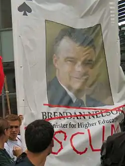 In 1998, VCASU stopped the introduction of Up Front Fees at the VCA by staging a tent city on administration lawns.[9] In 2003 VCASU led a militant campaign to reinstate VCA sessional staff which were to lose their jobs due to a "budget deficit" according to VCA Director Andrea Hull.[10] In 2004, VCASU were involved in the student occupations at VCA,[11] RMIT University[12] and Monash University[13] against the Howard Government's increased HECS fees. Also in 2004 VCASU protested against the then Federal Minister for Education, Brendan Nelson while visiting the VCA campus by dressing as Grim Reapers and labeling him the "Minister for Higher Execution".[14] In 2008 VCASU accused UoM of forcing the closure of their union, a charge the university denies.[15] The union was also involved in protesting academic staff cuts in 2008 by attempting to disrupt a UoM council meeting.[16]