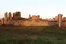 To the northwest of the villa was a series of houses with warehouses, temples and cisterns. This was where the rural population lived and most of the agricultural and domestic activities took place. The area has not been the subject of archaeological investigation but remains of a small temple are clearly visible. This was rectangular and constructed of brick, had vaulted ceilings and was gabled. It contained a rectangular apse for the Divine Statue. The area of the villa also contained a Hippodrome,[2] as well as cisterns that obtained their water from an aqueduct dedicated to the villa. Remains of one of the cisterns form the foundations of a farmhouse on the property.[3]