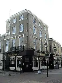 The Thieves’ Kitchen (formerly Vintner’s Parrot and before that Thieves Kitchen) is a pub in the centre of the town and borough of Worthing, West Sussex. Established as a public house in the late 20th century, it occupies two early 19th-century listed buildings in the oldest part of the town: a Greek Revival-style former wine merchants premises,[1] and a Neoclassical chapel built for Wesleyan Methodists in 1839.[2] The main part of the pub is in the wine merchants building facing Warwick Street, while the old chapel (usually called Bedford Hall), facing Bedford Row, serves as its function room. Both buildings have been designated separately as Grade II Listed Buildings.[3][4]