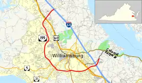 State Route 199 (SR 199) is a primary state highway in the U.S. state of Virginia. Known for most of its length as Humelsine Parkway, the state highway runs 14.13 miles (22.74 km) from Interstate 64 (I-64) and SR 646 in Lightfoot to SR 641 near Williamsburg. VA 199 forms a western loop of Williamsburg in York and James City Counties. The state highway, which is entirely a four-lane limited-access highway with a mix of intersections and interchanges, provides access from I-64 to several highways that serve attractions around Williamsburg, including U.S. Route 60 (US 60) and Colonial Parkway, an automobile parkway that leads to Colonial Williamsburg, Jamestown, and Yorktown. VA 199 between its junctions with I-64 is named for Carlisle H. Humelsine, a former curator and president of Colonial Williamsburg, in 2004.[3]