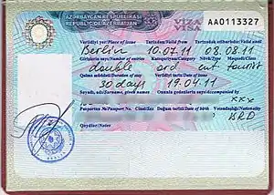 Passport must be valid for at least 6 months after the expiry date of the Azerbaijani visa applied for.[1] If there is less than 3 months for the expiry of a foreign citizen's passport, a visa will not be granted.[2] Citizens of specific countries listed, who are required to obtain a visa with an ordinary passport or with a service passport, have to obtain a visa before travelling to Azerbaijan. Visas are issued in at an embassy or consulate of the Republic of Azerbaijan or upon arrival at the border crossing points of the Republic of Azerbaijan.[3] The visa application form may be filled online and submitted to the diplomatic mission.[4]