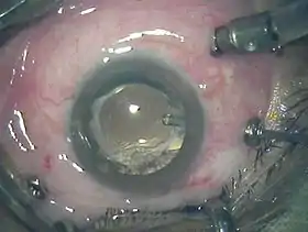 Lensectomy – In some cases, a lensectomy, or "cataract surgery," is done in conjunction with the vitrectomy. This extra procedure is performed when the lens of eye is cloudy (cataract), damaged during the vitrectomy, if there is attached to scar tissue, or if the pressure in the eye needs to be lowered (as in the case with some glaucomatous patients).[7]