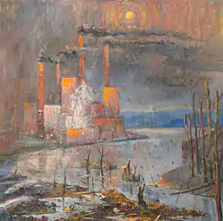 In the beginning of the seventieths, many things that Tomilovsky painted before stopped satisfying him. Over sudden he felt the fast pulse of the new industrial developments in Siberia. Being inspired by the technological progress, Tomilovsky asked himself a profound question: ‘what should a new art be like?’ He answered his question with a new topic in his art dedicated to depicting the massive hydroelectric stations construction sites, which were the grandest and the most inspirational developments in Siberia at that time. This new inspiration was a major turn in the artist’s creative style as Tomilovsky decided that such pieces of art should not be ‘painted’ but rather ‘constructed’ as the industrial developments themselves. It was the new style of Tomilovsky’s paintings which aimed to depict the grandeur and scale of the Soviet construction projects of the second half of the 20th century. According to A. Madisson, this period of Tomilovsky’s art could be characterised by the opinion he stated at the opening of one of his exhibitions: ‘We should enter the spaciousness of the brand new art, wide vision, and bolder solutions, where all the small and unnecessary is swept aside’.