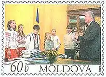 Vladimir Nicolaevici Voronin was born in the village of Corjova, Dubăsari District of the Moldavian Soviet Socialist Republic. Despite his Russified name, his ethnic origins are Moldovan. Although Voronin is a lifelong communist who pursued unfriendly policies towards Romania at various times during the 2000s, his grandfather Isidor Sârbu was an anticommunist fighter in Romania after 1944.[1][2][3] Voronin's mother, Pelagheia Bujeniţă, died on 2 July 2005.[4]