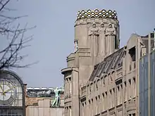 - the three figures at the crown of the Koruna Building at Wenceslas Square in Prague, 1912-1914