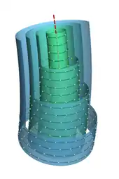 In a stationary vortex, the typical streamline (a line that is everywhere tangent to the flow velocity vector) is a closed loop surrounding the axis; and each vortex line (a line that is everywhere tangent to the vorticity vector) is roughly parallel to the axis. A surface that is everywhere tangent to both flow velocity and vorticity is called a vortex tube. In general, vortex tubes are nested around the axis of rotation. The axis itself is one of the vortex lines, a limiting case of a vortex tube with zero diameter.
