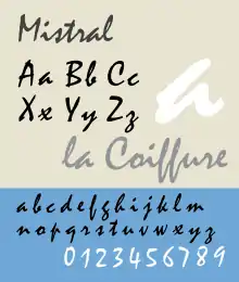 Examples of script typefaces include Shelley, Mistral and Francesca.[3]