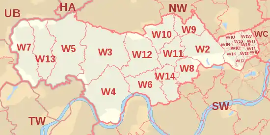 The W (Western and Paddington) postcode area, also known as the London W postcode area[2] is a group of postcode districts covering part of central and part of West London, England. The area originates from the Western (W1) and Paddington (W2-14) districts[3] of the London postal district. This area covers 35 postcode districts and around 18,554 live postcodes.