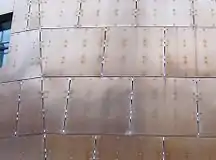 The WMC's main feature, the bronze coloured dome which covers the Donald Gordon Theatre, is clad in steel that was treated with copper oxide. It was designed to withstand the weather conditions on the Cardiff Bay waterfront and will look increasingly better with age. The architect, Jonathan Adams, decided not to use copper and aluminium as they would both change colour with age and weather conditions.[22]