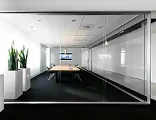 Some partition walls are made of sheet glass. Glass partition walls are a series of individual toughened glass panels mounted in wood or metal framing. They may be suspended from or slide along a robust aluminium ceiling track.[5] The system does not require the use of a floor guide, which allows easy operation and an uninterrupted threshold.