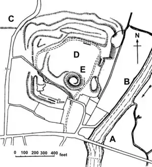 Wallingford Castle was probably built by Robert D'Oyly between 1067 and 1071. Robert had married Wigod's daughter Ealdgyth, and ultimately inherited many of his father-in-law's lands.[3] The wooden castle was built in the north-east corner of the town, taking advantage of the old Anglo-Saxon ramparts, with the motte close to the river overlooking the ford, and required substantial demolition work to make room for the new motte-and-bailey structure.[5] Unusually, it appears that the castle was constructed on top of high-status Anglo-Saxon housing, probably belonging to former housecarls.[6] The motte today is 60 metres (197 feet) across and 13 metres (43 feet) high.[7] Robert endowed a sixteen-strong college of priests within the castle, which he named St Nicholas College.[8]