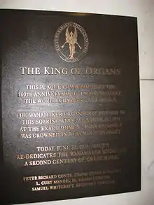 The Wanamaker Organ is a concert organ of the American Symphonic school of design, which combines traditional organ tone with the sonic colors of the symphony orchestra. In its present configuration, the Wanamaker Organ has 28,750 pipes in 464 ranks.[5] The organ console consists of six manuals with an array of stops and controls that command the organ. The organ's String Division forms the largest single organ chamber in the world. The instrument features eighty-eight ranks of string pipes built to Wanamaker specifications by the W.W. Kimball Company of Chicago.[5] The organ is famed for its orchestra-like sound, coming from pipes that are voiced softer than usual, allowing an unusually rich build-up because of the massing of pipe-tone families. The organ was also built and enlarged as an "art organ," using exquisite craftsmanship and lavish application of materials to create a luxury product. There is a minimum of borrowing and unification in its disciplined design. The Wanamaker Store maintained its own organ factory to ensure an ultra-high-grade result. The artistic obligation entailed by the creation of this instrument has always been honored, with two curators employed in its constant and scrupulous care (what leads to the state of one of the best maintained organ in the world).This dedication was enhanced when corporate parentage shifted from the Wanamaker family to Carter Hawley Hale Stores followed by Woodward & Lothrop, The May Department Stores Company, and Lord & Taylor. When the space was occupied by Macy's and with the founding of the Friends of the Wanamaker Organ with its input of outside capital, an aggressive restoration schedule developed and is still maintained. Current restoration efforts are a combination of Macy's expenditures and significant contributions by Friends of the Wanamaker Organ, a 501(c)3 non-profit dedicated to the instrument.