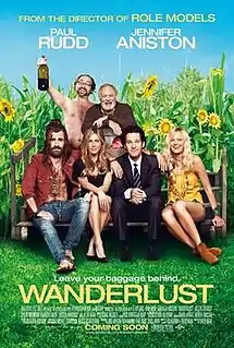 Wanderlust is a 2012 American comedy film directed by David Wain and written by Wain and Ken Marino, who also produced with Judd Apatow and Paul Rudd. The film stars Jennifer Aniston and Rudd as a married couple who try to escape modern society by finding themselves on a commune in Georgia, after the economy crashes down on their dreams in New York City.