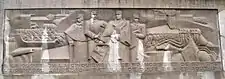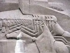 Guise was where Jean-Baptiste Godin, the humanist and philanthropist, built his factory which was intended as an example of how the working classes should be treated. Alongside the factory, Godin had built all the amenities which he considered the workers should have; housing, laundry facilities, a school, a theatre, gardens, a swimming pool, etc. In the grounds are a monument which remembers those Familistere men who lost their lives in the Great War, the Monument aux morts du Familistère de Guise, sculpted by the brothers Jan et Joël Martel (1896–1966). These brothers were well known as avant-garde and cubist sculptors.[14][15][16] Guise was also the scene of a fierce battle in 1914 when the 5th French Army, retreating before the advancing German armies, stopped their retreat and engaged with the enemy. The 5th Army was commanded by General Lanrezac and the Martel brothers were sculptors of the monument which marks this battle. Several photographs of the "Lanrezac monument" are shown below as are photographs of the Familistere monument aux morts. |