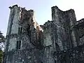 Between the towers at the level of the battlements are the remains of a projecting gallery or barbican which would have been used to defend the front entrance.