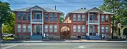 The apartments consist of two identical red brick buildings separated by a narrow courtyard to allow light into the interior apartments. The twin blocks are rectangular in plan with two above-ground floors and a basement, and overhanging hipped roofs. The facade of each building is symmetrical with three bays on either side of a projecting two-story porch with a gable roof and classically detailed columns and balustrades. Inside, the buildings are organized around a double-loaded central hallway with an oak staircase at either end. The apartments originally consisted of one-bedroom and efficiency units and were reported to have many original interior details intact as of 1981.[3]