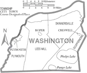 There are three incorporated towns in Washington County. Plymouth is the county seat. Other towns are Roper and Creswell. Washington County is known for rich farmland, extensive forests and abundant public access waters. The Roanoke River and Albemarle Sound form the northern boundary. Lake Phelps is 16,000 acres and is part of Pettigrew State Park in Creswell. Somerset Place is a restored antebellum plantation and NC Historic Site on Lake Phelps.