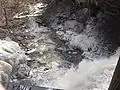 The Smokey Hollow Falls powered a sawmill and gristmill when the town was founded, and later a number of other small mills, and as a result of demand on the limited water supply, time shared the water. The last operating saw mill (Slater's Lumber Mill) continued to produce lumber well into the 1970s. It was located along the Grindstone Creek behind the Knox Presbyterian Church at the corner of Mill Street North and Church Street. During the 1950s and part of the 1960s the mill used horses and heavy tackle to haul the logs to the cutting area. Today, only remote foundation ruins of the mills remain, although a lookout over the falls and a signboard detailing the history of the area is in place.[17]