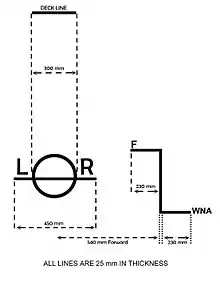Certain vessels are assigned timber freeboards, but before these can be assigned certain additional conditions have to be met. One of these conditions is that the vessel must have a forecastle of at least 0.07 the length of the vessel and of not less than standard height, which is 1.8 metres for a vessel 75 metres or less in length and 2.3 metres for a vessel 125 metres or more in length with intermediate heights for intermediate lengths. A poop or raised quarter deck is also required if the length is less than 100 metres. The letter L prefixes the load line marks to indicate a timber load line.[1] Except for the timber winter North Atlantic freeboard the other freeboards are less than the standard freeboards. This allows these ships to carry additional timber as deck cargo, but with the facility to jettison this cargo.
