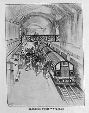 The underground station at Waterloo was located within the existing transverse arches of the main line station, with the arrival and departure platforms in separate arches, and a staircase access. Siding accommodation and a reversing siding were provided beyond the platforms: after disembarkation of passengers, an arriving train would continue forward to the reversing sidings, and then return to the departure platform. An additional lay-by siding was provided later.[11]