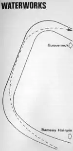 Following soon after Ramsey Hairpin, it is sequence of two right-hand bends in the direction taken by race competitors, situated at an elevation of 380 feet (116 metres) above sea level after the climb out of Ramsey town, and slightly before the 25th Milestone road-side marker on the 37+ mile circuitous-course, measured from the startline at the TT Grandstand. After Waterworks, the climb continues to Tower Bends and the Gooseneck.[2][3][4][5][6][7][8][9]