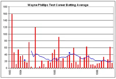 In the second test he made 21 in the first innings and came to the wicket in the second when Australia were 5–65 chasing 127. Phillips and Border put on 51 runs, taking Australia in sight of victory, with Phillips contributing an invaluable 29 off 32 balls.[44]