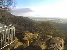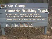 The Eualdrie walking trail leads from Holy Camp and is advertised as a 2.6-kilometre (1.6 mi) 2.5 hour return trip passing through Peregrine Lookout which takes 1.5 hours return. This was tested as 30 minutes to Perrigrine lookout, 23 minutes more to the Cairn at the summit and 40 minutes return. Peregrine Lookout is south of the carpark and from there the path turns back on itself as it proceeds upwards so that the cairn at the summit is a little north of the carpark. The path appears to continue past the cairn at Euradrie Trig (height 750 m) and can be followed down to Ben Halls Cave.[6]