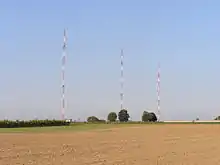 The transmitter Weißkirchen was a medium wave broadcasting facility located near Weißkirchen, Oberursel, Germany. It was the most powerful European AM transmitter of the American Forces Network and transmitted on 873 kHz with a power of 150 kilowatts. It started operation in May 1951 on 872 kHz and moved its frequency to 873 kHz in 1978 according to the regulations of Waveplan of Geneva. The transmitter ceased broadcasting on 31 May 2013, and was decommissioned in September 2014.[1] Its aerial consisted of three guyed lattice steel masts built in 1954-55. These masts, each eighty-six metres tall and insulated against ground, were arranged in a row with a distance of 140 metres between each mast. On 23 April 2015 the aerial was dismantled.[2]