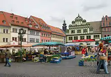 Like other eastern German cities, Weimar has a relatively small foreign population (compared to the German average): circa 4.0% are non-Germans by citizenship, while 7.9% have a migrant background (according to 2011 EU census).[11] Differing from the national average, the biggest groups of migrants in Weimar are Vietnamese people, Russians and Ukrainians. During recent years, the economic situation of the city improved: the unemployment rate declined from 20% in 2005 to 5.1% in 2019.[12] Due to the official atheism in the former GDR, most of the population is non-religious. 21.1% are members of the Evangelical Church in Central Germany and 6.8% are Catholics (according to 2011 EU census).[13]