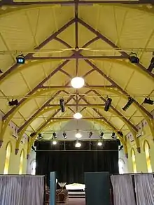 The northern brick addition houses a kindergarten with a kitchen connected to the western end of the timber hall. The hall is entered from the southwest corner, and has a hardboard panelled ceiling with a stage at the eastern end with a stylised proscenium arch. Backstage contains storage areas, and the southern addition to the hall contains various rooms.[1]