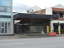 Completed in early 1953, West's Furniture Showroom was "designed with the utmost economy in the contemporary manner".[53] The showroom comprised a rectangular 64-by-34-foot (20 by 10 m) space with a cantilevered, upswept awning that extended over the Wickham Street footpath. The building was predominantly of masonry construction, with a glass shopfront, a concrete floor, and a shallow-pitched, asbestos- and bitumen-lined roof constructed from timber trusses. The roof-top was used as garden area for displaying outdoor furniture and some furniture assembly operations.[54][55][56][57] The existing timber residence was relocated to the rear of the site and converted for use as a workshop for the assemblage and storage of furniture. The workshop enabled access to the roof-top display area, and was level with Knapp Street for the loading of goods to transport vehicles. Its ground floor consisted of a woodwork shop, and the upper floor was designated for polishing and inventory storage.[58][59][60][61] Public access to the showroom was through a single timber door at the northeast end of the Wickham Street shopfront, adjacent to a random rubble stone wall. Projecting from the angled shopfront, the door frame was supported by glass, so that it appeared to float.[1][62]