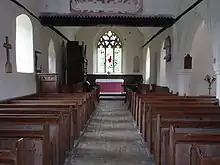 Later on, to remind all the villagers who was king, King James I had his royal coat of arms painted in the Church. This coat of arms can still be seen to this day if one stands in the gallery and looks towards the altar. The motto on the arms reads "Exurgat Deus Dissipenter Ininice", this is the opening line of Psalm 68[42] (Let God arise and let His enemies be scattered). Opposite James's arms is a set of Hanoverian arms acquired in 1816.[43]