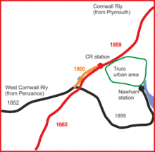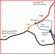 The high ground on which Truro is located had prevented the new line from approaching directly, but the Higher Town terminus was inconvenient; powers were obtained to extend the line to Newham, within the city of Truro and on the western bank of the Truro River, an arm of the River Fal. The new line made a broad southerly sweep and approached from the south. Its extent was about 2 1⁄2 miles (4 km), and it was opened on 16 April 1855. It diverged from the line towards Truro Road a little south of that station, and the Truro Road station was disused from that date.[3]