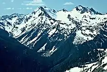 West Peak is a 7,365-foot-high (2,245 m) peak in the Olympic Mountains, in Jefferson County of Washington state.[2] Rising in the center of Olympic National Park, it is the highest peak on the Anderson Massif.[4] West Peak is the hydrographic apex of the Olympic Mountains, with precipitation runoff flowing outward to the Pacific Ocean via Quinault River, the Strait of Juan de Fuca via Elwha River, and Hood Canal via the Dosewallips River.[5] The Eel Glacier is situated in a cirque east of the summit, and an unnamed glacier resides in the south cirque. Its nearest higher peak is Mount Mystery, 7.73 miles (12.44 km) to the northeast.[1] The first ascent of the peak was made in 1930 by E. B. Hamilton.[3] Legend has it that the mountain's name is for Mr. West, a participant in the 1890 O'Neil Expedition, rather than for its apparent position on the Anderson Massif.[6] The West Branch of the Quinault River was named after him in 1890.[6]