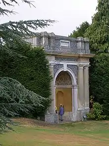 Classical architecture continues along the path around the lake, with the "Temple of Flora", a hidden summerhouse, and the "Temple of Daphne", both reminiscent of a small temple on the Acropolis. Another hidden temple, the "Round Temple", has a curved loggia. Nearer the house, screening the service wing from view, is a Roman triumphal arch, the "Temple of Apollo", also known (because of its former use a venue for cock fighting) as "Cockpit Arch", which holds a copy of the famed Apollo Belvedere. Close by is the "Temple of Diana", with a small niche containing a statue of the goddess. Another goddess is celebrated in the "Temple of Venus". Below this is an Exedra, a grotto (known as Venus's Parlour) and a statue of Mercury. This once held a copy of the Venus de' Medici; it was demolished in the 1820s but was reconstructed in the 1980s and now holds a replica of the Venus de Milo.[39]