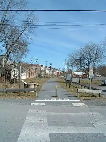 The trail runs on the abandoned right-of-way of the Western Maryland Railway's West Subdivision. The line was officially abandoned in 1975 and the final train on the line, a work train that removed the rails between Big Pool and Tonoloway, was run in December 1988. The portion through the C&O Canal National Park reverted to the Park Service in 1980.[1] In August 1990, the Maryland Department of Natural Resources purchased the right-of-way from 1/2 mile west of Fort Frederick State Park to Little Orleans through Hancock from CSX Transportation. Construction began on the first ten-mile (16 km) section from Fort Frederick to Hancock in 1997 and was completed in 1998. The second section, running 10.3 miles (16.6 km) from Hancock to Pollypon, a small body of water where canal boats would winter, began in 2001 and opened on June 10, 2002. Construction began on the third section, a 2.1-mile (3.4 km) extension from Pollypon to Pearre Station in 2003 and it opened in 2005.[2]