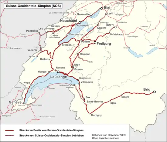 The Western Switzerland–Simplon Railways (Suisse-Occidentale–Simplon; SOS) was created on 26 June 1881 as a result of the purchase of the Simplon Company (Ligne du Simplon; S) by the Western Switzerland at a price of around CFF 13.2 million. Since the Simplon Company was financially too weak to promote the construction of a Simplon tunnel, the canton of Vaud in particular pushed for a merger of the two railways. The SOS, with investment capital of CHF 248 million and a network length of 581 kilometres, was the largest railway company in Switzerland at the time. The Geneva–Lausanne–Brig routes and the extensions from Lausanne via Romont to Bern and via Yverdon and Neuchâtel to La Neuveville formed its main route network. Its strategically most important goal was the building of a connection from Brig to Domodossola by tunnelling under the Simplon Pass, but this did not proceed for the time being. The SOS invested around CFF 670,000 in preparatory work in 1886 alone.