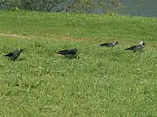 Opportunistic and highly adaptable, the western jackdaw varies its diet markedly depending on available food sources.[86] They have been recorded taking eggs and nestlings from the nests of the skylark (Alauda arvensis),[87] Manx shearwater (Puffinus puffinus), razorbill (Alca torda), common murre (Uria aalge), grey heron (Ardea cinerea),[82] rock pigeon (Columba livia),[88] and Eurasian collared dove (Streptopelia decaocto).[82] A field study of a large city dump on the outskirts of León in northwestern Spain showed that western jackdaws forage there in the early morning and at dusk, and engage in some degree of kleptoparasitism.[89] The saker falcon (Falco cherrug) has been reported stealing food from western jackdaws on powerlines in Vojvodina in Serbia.[90]
