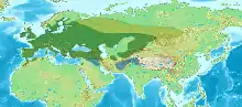 The western jackdaw is found from Northwest Africa through all of Europe, except for the subarctic north, and eastwards through central Asia to the eastern Himalayas and Lake Baikal. To the east, it occurs throughout Turkey, the Caucasus, Iran, Iraq, Afghanistan, Pakistan, and northwestern India.[26] However, it is regionally extinct in Malta and Tunisia.[1] The range is vast, with an estimated global extent between 1 and 10 million square kilometres (0.4–4 million square miles). It has a large global population, with an estimated 15.6 to 45 million individuals in Europe alone.[45] Censuses of bird populations in marginal uplands in Great Britain show that western jackdaws greatly increased in numbers between the 1970s and 2010, although this increase may be related to recovery from previous periods when they were regarded as pests.[46] The UK population was estimated at 2.5 million individuals in 1998, up from 780,000 in 1970.[47]
