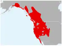 The range of the western toad extends from western British Columbia and southern Alaska south through Washington, Oregon, and Idaho to northern Baja California, Mexico; east to Montana, western and central Wyoming, Nevada, the mountains and higher plateaus of Utah, and western Colorado.[5] Occurrences of the boreal toad from Yukon Territory, the Northwest Territories, and northwestern and north-central British Columbia have been reported.[7] Southern records of boreal toads in New Mexico have been published.[8]