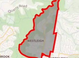Westleigh derived its name from its location, directly west of Thornleigh. Development as a residential suburb began in 1967 and was marketed by Stewart Upton a large real estate firm following the subdivision of the area bounded by Duneba and Eucalyptus Drive, and the former riding school which was situated near Billarga Road. Prior to this time the area was rural with many citrus orchards, with a small number of homes on acreage along Quarter Sessions Rd, extending north towards the former sandstone quarry near "Blackfellow's Head", which was used as a dumping ground for stolen cars of the 1940s and 1950s. The area was originally heavily timbered, so many streets bear the names of Australian trees such as Stringybark Close, Spotted Gum Road, Eucalyptus Drive, Hibbertia Place, Peppermint Gum place and Ironbark Close.[3] Although the naming of the streets seems only vaguely related to what was there before houses arrived, and many streets named for plants contain not a single representative specimen. Westleigh was originally a housing estate west of Quarter Sessions Road. A small parcel of land was opened at the same time on the eastern side of Quarter Sessions Rd and this include Gum Blossom Drive and Bottle Brush Road. While classified as Thornleigh West for it postal address it was given a Westleigh address in the 1980s. This parcel of land was owned by a large home unit construction firm—RDC who built many project homes in Gum Blossom Drive. This company closed and the remaining land was sold to private parties in 1968.