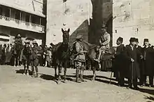 After the fall of Beersheba, the regiment was briefly split with C Sqn covering the advance of 53rd (Welsh) Division and A & B Sqns attached to the Australian Mounted Division operating between Beersheba and Gaza. It came back under XX Corps in November. A Squadron was the first formed body of troops to enter Jerusalem after the city had been surrendered to two sergeants of 2/19th Battalion, London Regiment, and the regiment bears the liberation of that city as a battle honour.[14][31]