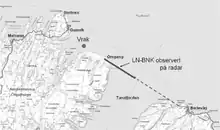 An employee at Kautokeino claimed that he had observed allied aircraft in the no-fly zone on the day of the accident, but investigations showed that he was not working in Finnmark in March. Investigations of the logs at Kautokeino and Sørreisa showed no entries regarding any NATO air traffic.[12] Captain Stein Aarbogh, working at Setermoen gunnery range, stated that on the day of the accident two Harriers were expected, but showed up several hours late, at around five o'clock in the afternoon. Aarbogh was certain of whom was range officer at the gunnery range on the day of the incident, but the commission could document that the person in question was working at Rygge Air Station on 11 March. Therefore, this incident could not have taken place on the day of the accident.[15]