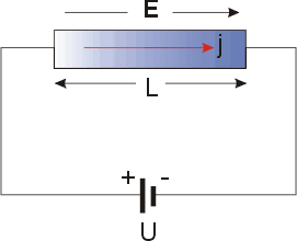 The mathematical expression of the law can be derived as following. Electrical conduction of metals is a well-known phenomenon and is attributed to the free conduction electrons, which can be measured as sketched in the figure. The current density j is observed to be proportional to the applied electric field and follows Ohm's law where the prefactor is the specific electrical conductivity. Since the electric field and the current density are vectors Ohm's law is expressed here in bold face. The conductivity can in general be expressed as a tensor of the second rank (3×3 matrix). Here we restrict the discussion to isotropic, i.e. scalar conductivity. The specific resistivity is the inverse of the conductivity. Both parameters will be used in the following.