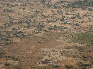 Approximately 15% of the country has forest cover while wooded land constitutes approximately 34% of the area. Very little closed forest can be found and this is mainly of the gallery forest type along waterways. The open forests include savanna of four types, namely Sahelian, Sahelian-Sudanian, Sudanian, and Sudanian-Guinean.[11] Though much of the country is dry and sparse, vegetation can vary considerably. Northern Burkina Faso consists mainly of savanna, acacia woodland, and during the wet season, prickly shrubs and stunted trees flourish.[1] Herbaceous plants include broadleaf deciduous, shrub, desert shrub, semi-desert savanna and thorny scrub. Crops include Banana, Cassava, Bougainvillea, Cotton, Guava, Maize, Spinach, Malabar Spinach, Millet, Onions, Papaya, Sorghum, Tomatoes, and Yams. Most of the country consists of sparse savanna grasslands, with the occasional shrub or acacia. Although the country only has about 15% forest cover overall, there are many forests in the south, growing denser along the banks of the perennial rivers.[1] These include Diéfoula Forest, Logoniégué Forest, Laba Forest, Dida Forest, Koulbi National Forest, Bontioli Reserve Forest, Nabere Partial Reserve Forest, Koflandé Forest, Maro Forest, Tui Forest, Deux Balés Forest, Kalio Forest, Tisse Forest, Dibon Forest, Pâ Forest, Mou Forest, Boulon Forest, Tigo Forest, Nakambe Forest and Niangoloko Forest, of which about 16% have official protection.