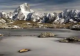 ![]() The Bietschhorn (left) and the Wilerhorn (right) from the Lötschen Pass (north side) | |