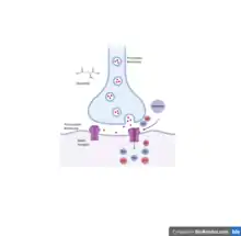 Like AMPA receptors, kainate receptors are tetrameric, transmembrane, ionotropic glutamate receptors on glutamatergic neurons. They have five subunits, divided into two main families: GluK1,2, and GluK5,6,7. An endogenous ligand, either kainic acid or glutamate, binds to the ligand binding site. However, unlike AMPA receptors, external ions also bind to kainate receptors at the ion binding pocket on the extracellular domain. When both the ligand and ion bind, the receptor undergoes a conformational change and the ion channel opens.[10] This allows the flow of positive ions, such as sodium or calcium. The influx of positively charged ions depolarizes, or excites, the neuron (Figure 4).[3] Like AMPA receptors, the permeability to calcium is dependent on the editing of receptor subunit mRNA. The rise and decay times of postsynaptic potentials is much slower in kainate receptors than AMPA receptors.[10]